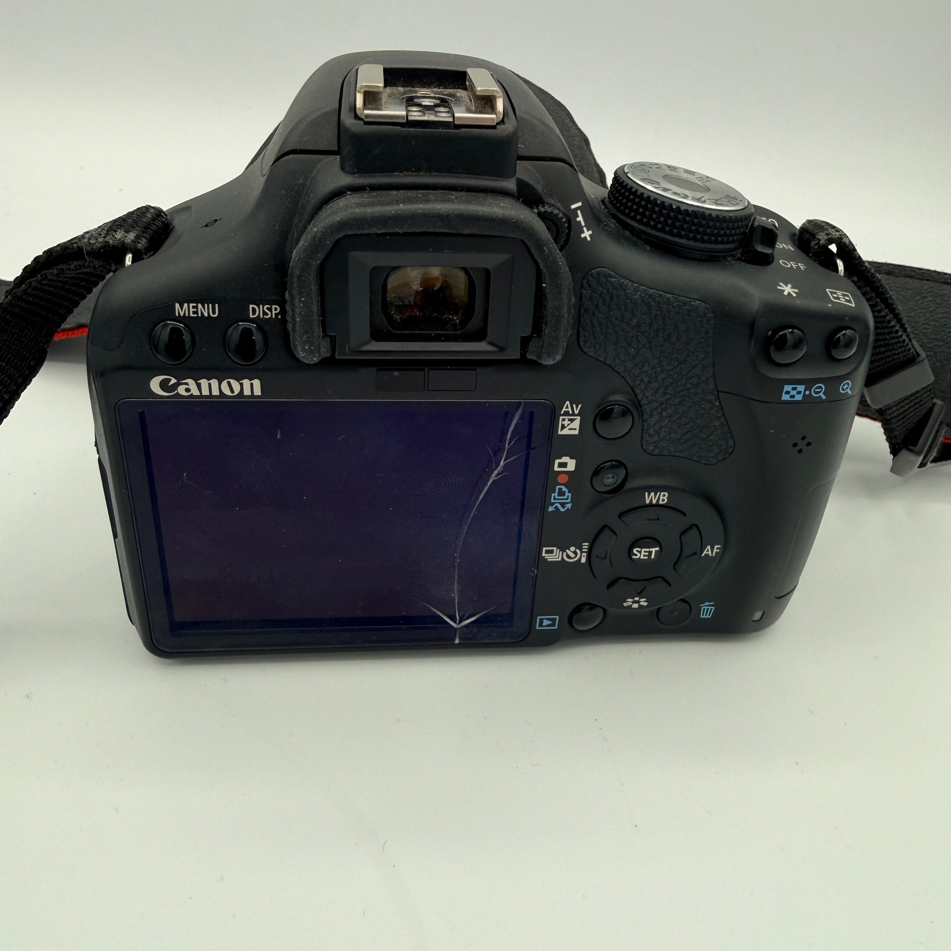 The camera shows moderate cosmetic wear consistent with regular use. There are surfcace scuffs and handling marks on the body and strap. The rear LCD screen has a visible crack. Lens mount, buttons, and dials appear intact with no obvious signs of damage beyond normal wear.